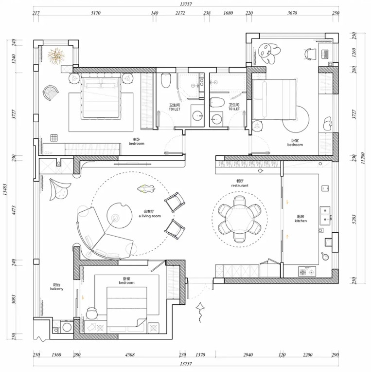 请将这张黑白CAD平面图渲染成一张彩色的室内设计平面图